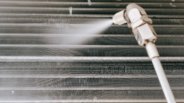 高圧洗浄機で熱交換器内部、ドラム(送風口)の奥まで汚れを除去。