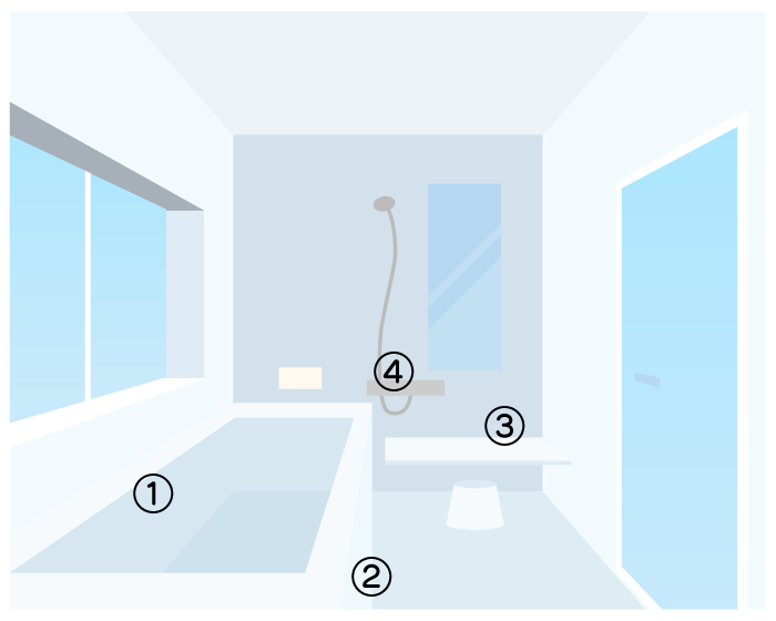 浴室コーティング | ① 浴槽(縁上含む) ② 浴槽パネル(側面) ③ 洗面台 ④ 水栓金具 |